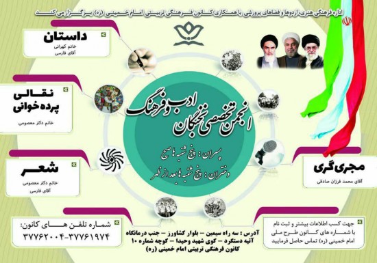 برگزاری کارگاه های تخصصی در چهار رشته : شعر - داستان - مجری گری - نقالی و پرده خوانی با حضور اساتید مجرب استان در راستای آموزش و هدایت دانش آموزان مستعد و علاقه مند ، به همت اداره فرهنگی هنری، اردوها و فضاهای پرورشی اداره کل آموزش و پرورش استان اصفهان. ..