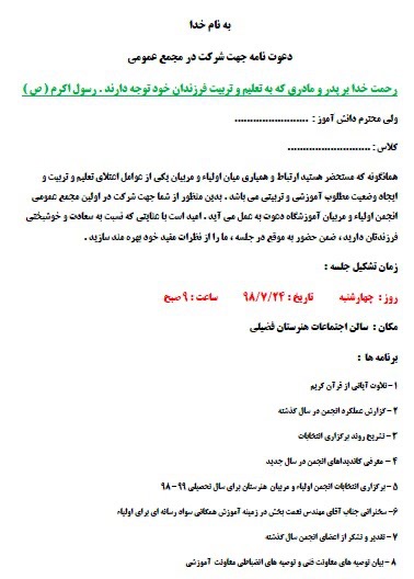 دعوتنامه شرکت در اولین مجمع عمومی اولیا و مربیان هنرستان فضیلی